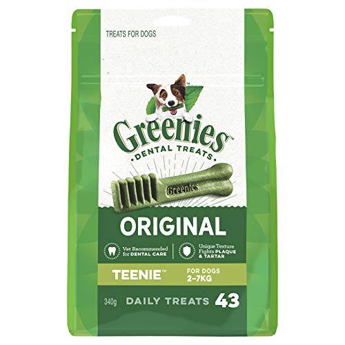 Keep your small dog's teeth clean and healthy with GREENIES Dog Dental Chews, the top vet-recommended dental chew. Our natural TEENIE Size chews are specifically designed for dogs weighing 5-15 pounds.