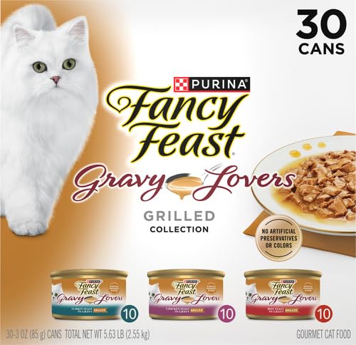 Indulge your feline friend with the Fancy Feast Gourmet Cat Food 3-Flavor Variety Pack. This pack includes 24 3-ounce cans of delicious wet cat food, featuring three mouth-watering flavors: Beef, Chicken, and Turkey & Giblets.