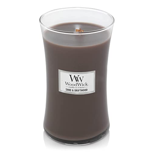 Experience the soothing sound of a crackling fire with our WoodWick Large 21 Oz. Candle in Sand/Driftwood scent. This highly fragranced candle features a natural wooden wick, creating a cozy ambiance that's perfect for any room.