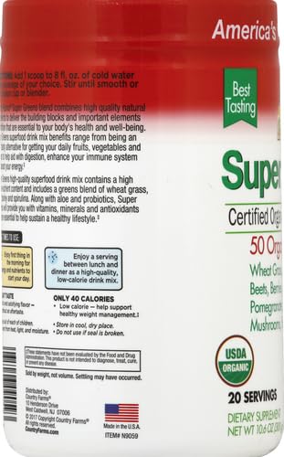 COUNTRY FARMS Super Greens Natural Flavor 50 Organic Super Foods Packed with Fiber USDA Organic Drink Mix Fruits Vegetables Super Greens Mushrooms & Probiotics Supports Energy 6g Fiber Price in USA