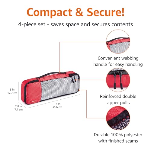 Organize your travel essentials effortlessly with the Amazon Basics Lightweight Packing Cubes 4-Piece Set. Crafted from durable 100% polyester, these slim red packing cubes are designed to maximize space, improve organization, and make packing and unpacking a breeze.