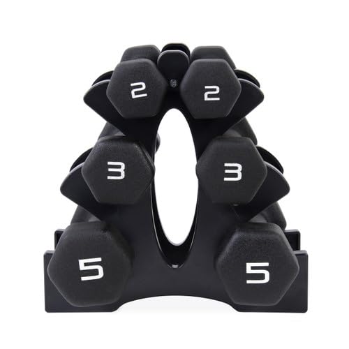 The CAP Barbell 20 Pound Neoprene Dumbbell Set with Rack is a compact set that is perfect for travel. The dumbbells are designed with hexagon shaped heads so they do not roll and are made with cast iron coated in neoprene for a comfortable grip. This dumbbell set offers the ability to workout indoors or outdoors. The set includes a convenient storage rack and three pairs of dumbbells: 2 lb 3 lb and 5 lb. Dumbbells offer the ability to target specific muscle group exercises or get a full body workout. Using dumbbells during exercise routines offers many health benefits including building muscle improving core strength boosting balance providing better bone health burning calories increasing energy levels enhancing overall mood and more!