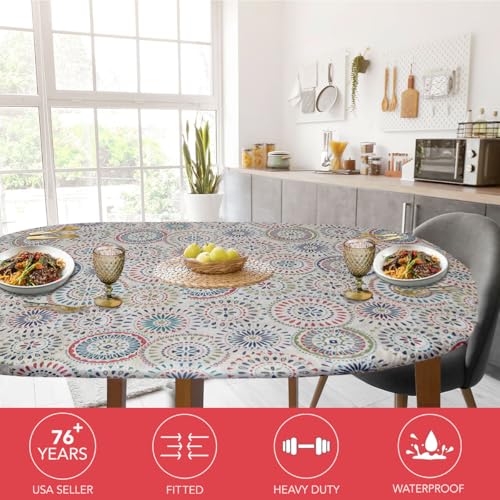 Specifications & Details: The Covers For The Home Elastic Edged Flannel Backed Vinyl Fitted Table Covers are designed to fit tables of up to 48" x 68" in size. The table cloth is made of sturdy PEVA vinyl and features a flannel backed design for added protection. The multi-color geometric medallion pattern is a classic design that will complement any room. The table cloth is waterproof and easy to clean, making it perfect for families with kids or pets.