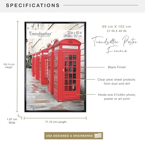 The MCS Trendsetter Frame is a simple and functional black frame that makes it easy to frame your posters photographs and finished puzzles. The Trendsetter line features a wide 1-inch frame for added stability and strength as well as a shatterproof styrene face designed to prevent breakage during shipping and enhance safety during handling. For easy display gently lift the attached flex tabs remove the cardboard backing insert your desired medium reinsert the cardboard backing and gently flatten the attached flex tabs. Attached to the back of each photo frame are hinged hangers for easy vertical or horizontal frame mounting. (Instructions included). The Trendsetter has become one of our top sellers over the years and will provide you the service and quality you expect from MCS frames. The minimalist contemporary design will never go out of style and is always available for the right price.