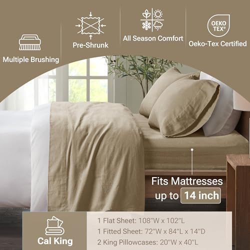 Specifications & Details: The True North by Sleep Philosophy Cal King Sheet Set with Tan Solid TN20-0120 is designed to provide a comfortable and restful sleeping experience. With its 100% cotton flannel construction and OEKO-TEX certification, this product is perfect for those who value quality and safety. The set includes 1 fitted sheet, 1 flat sheet, and 2 pillowcases, making it a complete bedding solution. The fitted sheet fits mattresses up to 16 inches deep, ensuring a secure and comfortable fit.