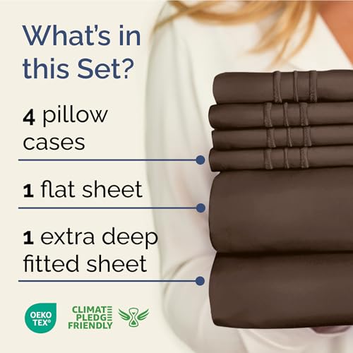 CGK Unlimited 4-Piece Cal King Size Sheet Set with Deep Pockets. Many Cal King sheet sets are made of low-quality bedding fabric that tears easily and feels rough and uncomfortable against the skin. Our CGK Unlimited Cal King size fitted sheet & flat sheet set uses super-fine double brushed microfiber fabric which means that our California King sheets luxury bedding feel softer than 1 000 1500 and 1800 thread count sheets. Our tightly woven 4-piece sheet set ensures softness coupled with extra strength and durability. Plus breathable brushed microfiber products are a great option. CGK Unlimited’s 4-Piece Sheet Package Includes: 1 Flat Sheet (108” x 102”) 1 Fitted Sheet (84” x 72”) 2 Cooling Silky Pillowcases (20” x 40”). Perfect Fit. While many deep pocket sheets California King are ill-fitting and can be a struggle to get on the bed our California King fitted sheets have deep pockets to easily fit mattresses up to 16 inches so making the bed takes half the time. Fits comfortab