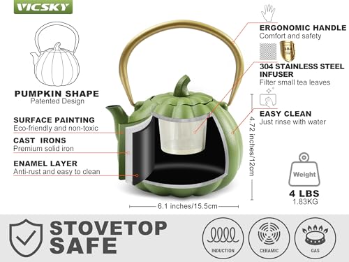 VICSKY Pumpkin Cast Iron Teapot (40 oz/1200 ml) Natural Pump...