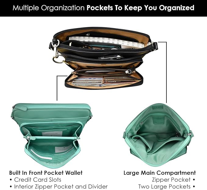 This leather organizer bag is not only beautiful on the outside but a workhorse on the inside. Our soft leather crossbody purse is easy to wear easy to style and easy to love. Multiple pockets will fit the every day essentials and the built in wallet keeps your cards money and keys at your fingertips. This genuine leather shoulder bag has a front organizer pocket and silver hardware top zipper main compartment wall safety zipper pocket wall patch front pockets and attached dog hooks. It has an outside front zipper pocket with organizer open pocket and back pocket with hidden magnetic closure. The leather strap is adjustable. PLEASE NOTE THERE ARE NOW TWO SIZES: The smaller size has small after the color: MOCHA SMALL Dimensions: LARGE SIZE: 9.75 x 7 x 4 inches SMALL SIZE: 7 X 9 X 3 inchesLeather