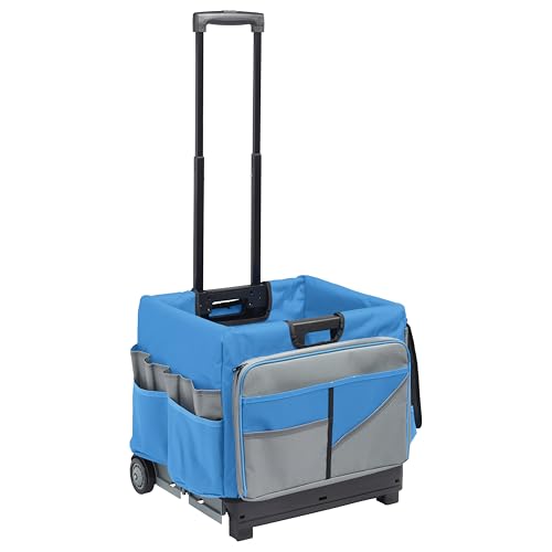 Perfect for carrying school supplies files classroom equipment and more! The Universal Rolling Cart accommodates letter or legal size folders hanging files and binders and features build-in hand grips for easy moving and lifting. Double rails lock the sides securely in place. The saddlebag-style canvas cover features over 30 different storage compartments and can be easily added to or removed from the cart. Pockets have zippers or hook & loop closures for securing supplies and files during travel. Cart folds flat to 3” for easy storage when not in use. Telescoping handle extends up to 23” from the cart and locks in three positions for easy mobility on rubber wheels. Cart capacity is 65 lbs (29 kg). Accessories not included.
