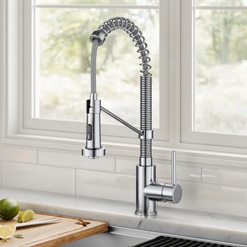 Create a clean modern look with the Bolden Commercial Style Kitchen Faucet built to last with a metal body and heavy-duty open-coil spring spout. The kitchen faucet with pull down sprayer and swivel adapter offers an extended range of motion all around the sink. 2-function pull down kitchen faucet sprayhead with stream and spray has soft rubber nozzles that allow you to wipe away mineral build-up for easy maintenance. This ADA-compliant single handle kitchen sink faucet is designed with 90-degree forward handle rotation for installation in tight spaces. Pre-attached water lines and mounting hardware included for easy DIY installation. Wear-resistant finish is not prone to corrosion or fading. Available in Spot-Free Finish that helps prevent water spots and fingerprints for easy cleaning.
