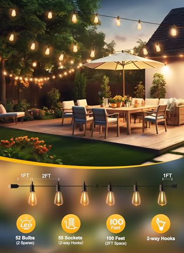 Brightown LED Outdoor String Light 100Ft Patio Lights with 52 Edison Shatterproof Bulbs Waterproof Outside Lights for Backyard Balcony Xmas Decor Price in USA