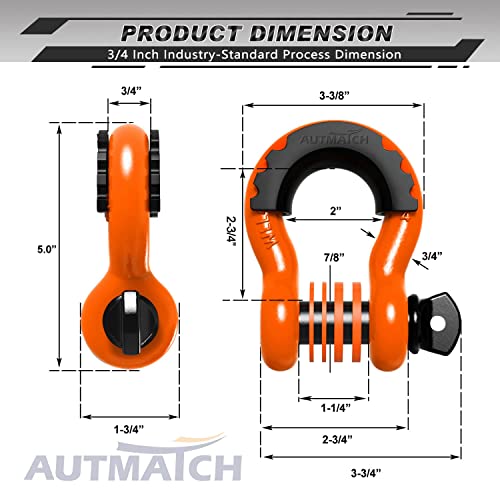 The AUTMATCH Products Heavy-Duty 3/4 Inch D-Ring Shackle Provides Superior Towing Power For Vehicle Recovery or Heavy-Duty Towing Needs. Made of Drop-Forged Steel This Tow Shackle Features A Towing Capacity Up To 4.75 Tons (10 471 Pounds) With An Industry-Standard 7/8 Inches Screw Pin To Keep It In Place and Stable While Pulling or Towing. And Is Galvanize&Powder-Coated For Rugged Durability and Lasting Performance. Ideal Off-Road Versatility For Use With Recovery Tow Snatch Straps Snatch Blocks Tree Savers And More. Universal Design and Great For ATV UTV Trucks Trailers and Sport-Utility Vehicles. With This Shackle Easy To Install Reliable To Use. Included: 3/4\" D-Ring Shackle + Isolator + Washers Kit TOP: Heavy Duty Drop Forged Materials: Steel COMPLETE RECOVERY SHACKLE SET: *Added Washer Kits And Isolators For Noise Reduction and Protecting The Bumper While Having The Towing D Ring Mounted *Made From