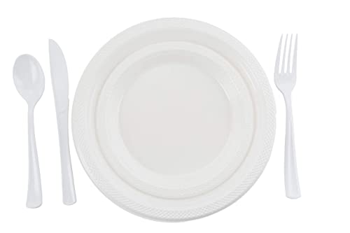 Make your next event effortless and stylish with our disposable party dinnerware set perfect for any occasion. Ideal for up to 50 guests this set includes 50 9\" white plastic dinner plates 50 7\" white dessert plates 50 12 oz white plastic cups 50 13\" white napkins and 50 plastic forks plastic spoons and plastic knives. Crafted from durable BPA-free materials this set ensures safety while holding up well throughout your celebration. Whether you're hosting a birthday party picnic BBQ or family gathering this plastic dinnerware set has everything you need. The white plastic plates and disposable cups provide an elegant touch while the plastic silverware and heavy-duty plastic utensils are perfect for serving meals without the worry of breakage. Cleanup is a breeze with this disposable plates and plastic utensils set—just dispose of everything after the party and save time on washing dishes. Perfect for all occasions like 4th of July celebrations BBQs and more this set is