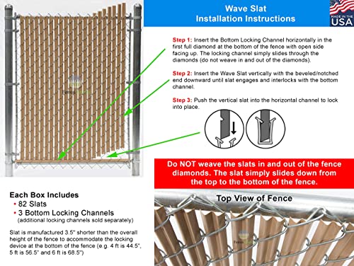 Wave Slat™ - Single Wall Bottom Locking Slat for Chain Link Fence Available for Fence Heights: 4’ 5’ 6’ 7’ and 8’ Coverage: Each box will cover approximately 10 linear feet of fence (2\" diamond 82 slats 41 diamonds). The bottom locking devices are included (3 pieces) and will be enough for ten feet of fence. Specifications: Slat is manufactured 3.5\" shorter than the overall height of the fence to accommodate the locking device at the bottom of the fence (e.g. 6 ft is 68.5\") Wind load factor and privacy factor for 2\" diamond is approximately 85% (1.25\" [slat width] x 82 [number of slats] ÷ 120\" [10' of fence] = 85.4% coverage) Slat width is approximately 1.25\" Designed for 2\" to 2.375\" diamond and 9 10 11 11.5 gauge wire. A 2\" diamond will provide approximately 85% privacy and a larger diamond will have less privacy (smaller diamond size will provide better privacy). Made of HDPE (plas