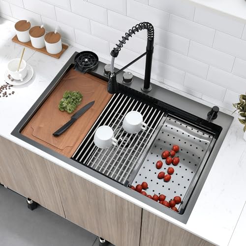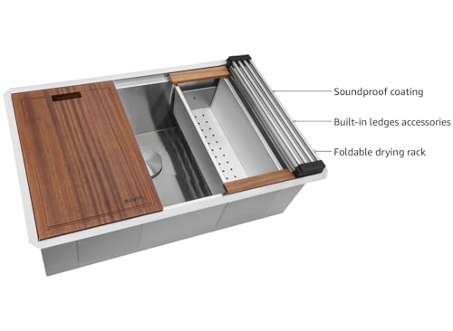 Convert your kitchen sink into a fully functional workstation with the Roma collection from Ruvati. Featuring an undermount installation and sharp inside corners modernity is apparent. The workstation design features a built-in ledge that provides a platform for Ruvati’s unique accessories. Each sink in the Roma collection features a solid hardwood cutting board and decorative drain cover. Some also include a stainless steel colander or Ruvati’s patented foldable drying rack. With the Roma collection you can do all your prep work on top of your sink and keep your countertops free of mess. WORKSTATION SINK: Ledges on the front and back provide a track for the included accessories. LEDGEFIT: Sink is compatible with 40+ optional LedgeFit accessories that are interchangeable between different Ruvati workstation sinks giving you endless kitchen customization options now and into the future. 16 GAUGE STAINLESS STEEL: Premium T-304 Grade (18/10 Chromium/Nickel) will never rust or stain. C