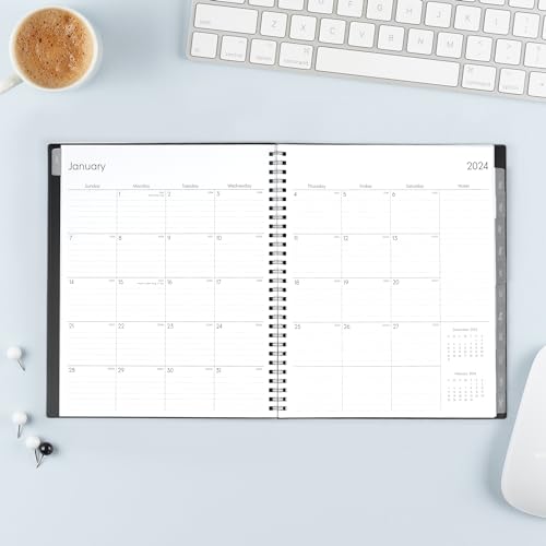 Plan your year in style with the minimalistic design and classic colors of the 2025 calendar year Enterprise collection. This stylish weekly and monthly planner will keep you organized everywhere you go. Simple page designs add a touch of sophistication and offer plenty of room for all of your important information. Designed with practicality and ease of use in mind this professional agenda's monthly calendar tabs allow for easy access to each month’s plans while weekly views offer ample writing space for detailing each day. High quality white paper provides clean writing space for jotting down your appointments to-dos and reminders. Use this dated planner to keep track of your appointments and to write down notes and ideas in one place. Durable coated tabbed dividers are long lasting and make accessing information a breeze. Premium quality covers and twin-wire binding provide reliable durability for daily use. Stay on track throughout the year with this portable 5.875 x 8.625 plann