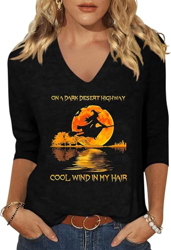 Women's Fall Halloween Witch V Neck Shirt On a Dark Desert H...