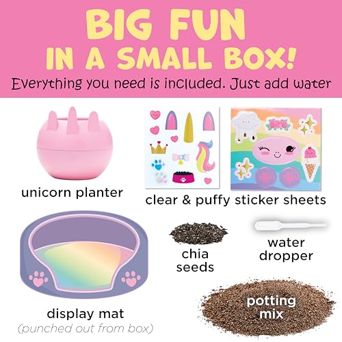 Decorate plant and grow your own mini garden in an egg-shaped mini environment. Complete with everything you need to grow your own mini garden each kit includes potting mix quick growing chia seeds themed stickers dimensional accents fun mini figures and decorative sand. Mini Gardens available in 3 themes â Unicorn Mermaid or Dinosaur â collect all three! Chia seeds start sprouting in 3-5 days. Finished gardens measure 5 ¼â h x 3â w. Ages: 6+ Contents Include: plastic egg terrarium potting mix water dropper sticker sheet colored sand (red blue orange) white gravel unicorn figure rainbow figure adhesive back rhinestones DOWNLOAD INSTRUCTIONS Warning: NONE