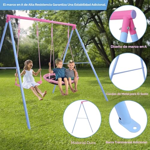 backyard swing set comes with a large solid saucer swing AND a sturdy heavy duty swing set. All of them are constructed of powder-coated steel to resist rusting and UV-protected polyethylene plastic to reduce heat retention fading and discoloration. Unlike a wooden swing set with a metal construction there are no splinters warping or rough edges. A SWING SET FOR KIDS ISN’T JUST FUN IT’S HEALTHY TOO!It can be great fun for children teens and adults alike! If you haven’t been on a swing since you were a kid we think you should try our swing it is safe and fun. Features: - Sturdy powder coating steel A-frame swing stand . - Durable steel frame saucer swing set with oxford cloth seat and nylon hanging ropes. large swing space frame . - Weather resistant and waterproof swing seat. - Comes with complete installation tools and drawing manual to guide you assemble this solid swing set. PACKAGES: 1PK swing frame 1PK 40