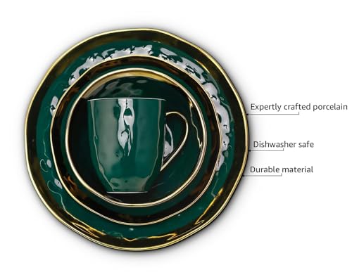 Green and Gold Set For 4 – 4 complete sets perfect for entertaining family and friends. Green with a gold trim. Elegant and regal plates bowls and cups. These home essentials are the ideal kitchen dishes. Round Plates Bowls Mugs – This elegant 16 piece dish set comes with 10” dinner plates 7.5” salad plates 4.5” bowls and 12 oz. mugs.