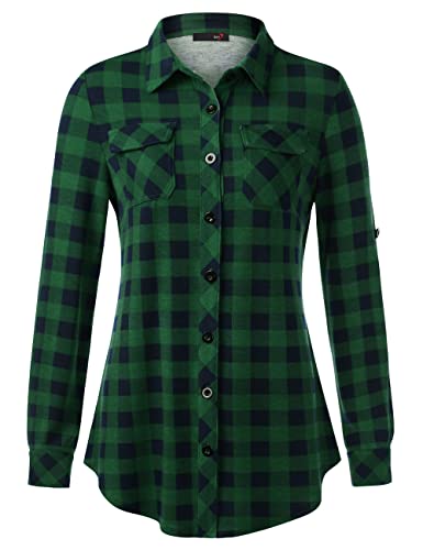 DJT Womens Soft Stretchy Knit Plaid Shirts Roll Up Long Sleeve Collared Button Down Blouses Tops Small Green Pattern
