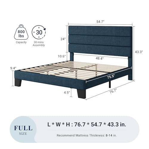 Product description Size: Full Color: Navy Blue For spring memory foam latex or hybrid mattress thicknees 8 to 14 inches. Better life begins with a good bed. This frame is composed of strong wood board and quality wooden slats which is sturdy and durable. The minimalist design provides a comfortable and relaxing style for your relax.Each of our beds is dedicated to our efforts just to satisfy you. At Allewie you can choose the bed that suits you best.Features details- Material: Knitted Polyester + Wood + Metal - Main Color: Navy Blue- Product Dimensions: 76.7 Inch x 54.7 Inch x 43.3 Inch- Include: Headboard frame and wood slats