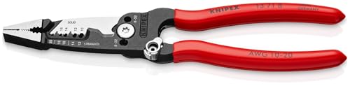 KNIPEX Tools new patent pending Forged Wire Stripper is a true game changer. It strips solid and stranded wire 10-20 AWG. Wire locating ridges make it easy to find stripping holes. It cuts 6-32 and 8-32 screws without threading from either the front or back of the tool. Cutting blades are designed to cut individual wires NM-B BX/MC and battery cable. Lock can be used either right or left handed. Knurled tip and wide flat jaws for better grip. Also includes wire looping groove and gripping area for pipes.