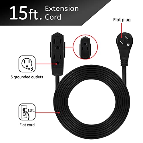 GE 3-Outlet Flat Extension Cord 15 Ft Grounded Extension Cord with Multiple Outlets 3 Prong Outlet Extender Flat Plug Power Strip Indoor Extension Cord 16 Gauge UL Listed Black 56987