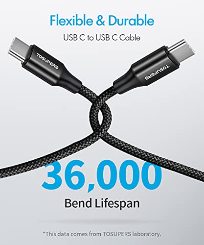 TOSUPERS USB C to USB C Cable IMPORTANT NOTE: 1. This is the USB-C to USB-C cable NOT USB-C to USB-A cable. To reach fast charge please use the original USB-C wall charger or other high-quality chargers which supports QC 2.0/3.0 and PD fast charging output power up to 60W (20V/3A). 2. This is charging and data cable Do Not support video output and monitor connection. 3. These cables are designed according to the USB 2.0 specification. Transmission speed is within 480Mbps (40-60MB/S). Product Features 2-PACK SUPER LONG USB C TO C CABLE Perfect 2-Pack 10ft Long USB Type C to C Cable suit for most occasions - home outdoor office car or bedroom you can recline on a couch or bed while charging and using your phone or laptop without limit by space or distance. 60W High Speed Charging High quality smart charging chip fast charging your USB-C laptops tablets and smartphones Say NO to Rupture