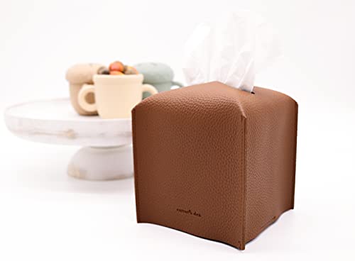 Tissue Box Cover Holder Square with Bottom Belt by Carrot's Den - PU Leather Decorative Organizer for Tabletop Bathroom Car Office | Camel