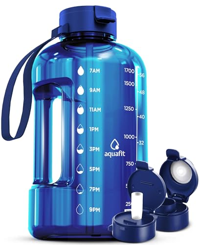 AQUAFIT Half Gallon Water Bottle With Time Marker - Straw & Chug Lid - Big Water Bottle With Straw - BPA Free Gym Water Bottle With Handle - Gallon Water Jug (64 oz - 2 Lids Blue 2)