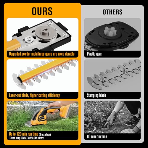 Get precise trimming with this 2-in-1 cordless grass shear and bush trimmer. It comes with a 5.5"" hedge trimmer blade and a 3.25"" grass shear blade to cut grass shrubs garden edges bushes and small trees. With sharp 65Mn steel blades and a 1100 RPM motor this mini hedge trimmer cordless cuts branches up to 0.31"" thick. This battery-operated hedge trimmer features a built-in 1500mAh rechargeable battery with a power indicator. No cords no limits—just grab this cordless grass shear and get to work in the front or backyard. It’s a great electric trimmer for yard work and works as a grass clipper shrub trimmer or bush trimmer cordless. Lightweight at only 1.36 lbs this handheld hedge trimmer is easy to carry and use with one hand. The ergonomic non-slip TPR handle offers comfort and control. Great for seniors and beginners looking for hand trimmers for gardening small hedge trimmers or a mini weed wacker. Stay safe with triple protection: a safety switch ON/OFF button and lo