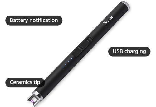 EASIER FASTER & CLEANER NO FUEL.NO GAS.NO FLAME.NO HARM -Say NO to spark & flame fuel fluid gas and harm.Electric lighter use more cleaner power than old fashion fuel-based lighter.SUPRUS lighter is both good for your health and the environment. RECHARGEABLE BATTERY -This Lighter use Li-ion battery it can be used more than 500 times(gas stove) per charge.Battery can be charged more than 500 times.Windproof without spark and no smell Just plug into powered usb port and take it everywhere. * It can be taken on the airplane* WINDPROOF DESIGN -It is an perfect tool for lighting under wind weather.With a longer handle you can use the lighter keep a distance of the fire without the fear of burning. EASY MAINTENANCE -Just clean the arc tip with a soft cloth after lighte candle(some attachments produced by candle burn.) Package Include:1 * USB Rechargeable Windproof Arc Lighter 1 * Micro USB cable 1 * Gift Box ★PLEASE R