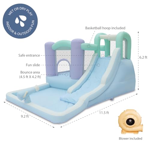The Officially Licensed Disney Mickey Mouse Funhouse Inflatable is a fun-filled residential backyard inflatable bounce and slide that features your favorite Disney characters. The Mickey Mouse Funhouse Inflatable is the inflatable bounce house version of the popular Disney animated show Mickey Mouse Funhouse. Join Mickey and Donald in the Funhouse where you will bounce and slide all day long. Features of the Funhouse inflatable include a bouncing area basketball hoop slide ball pit area and ring toss area. Up to 3 riders at a time can bounce with Mickey and Donald in this Funhouse Inflatable bounce and slide.