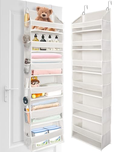 Maximize your storage space with the ULG Over Door Organizer designed for both efficiency and durability. Made from high-quality moisture-proof non-woven fabric this organizer features 5 spacious pockets (14.5\"L x 6.5\"W x 6.5\"H) and can hold up to 20KG making it perfect for storing toys shoes diapers and more. The innovative design includes reinforced cardboard along the front sides and bottom to prevent tilting and ensure stability even when fully loaded. Enhancing its functionality the organizer is equipped with 10 additional mesh pockets (6.5\"L x 6.5\"W each) on the sides ideal for keeping smaller items like keys chargers and remote controls within easy reach. A clear PVC window on the front allows you to see and access items quickly helping you stay organized. Versatile and easy to install this organizer is suitable for various spaces including children's rooms offices laundry rooms and bathrooms. It includes metal hooks that fit doors up to 2.0 inches thick makin