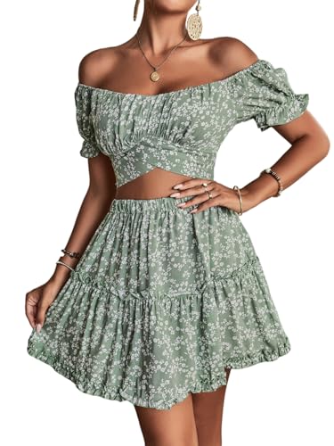 LYANER Women's 2 Piece Outfits Floral Off Shoulder Tie Up Cr...