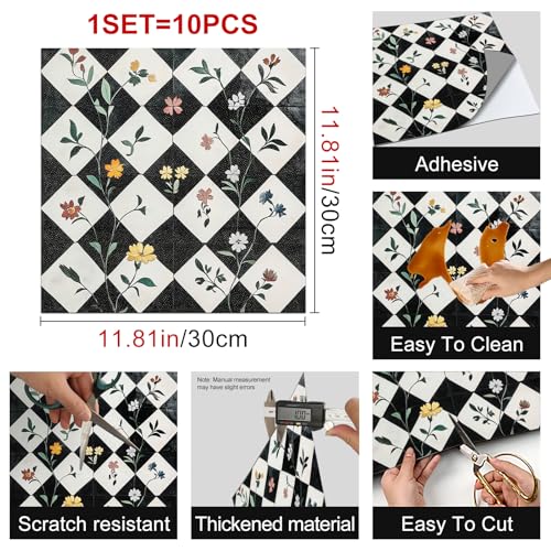 HOMETITUTE 10PCS 12x12 Inch Floral Checkerboard Peel and Sti...