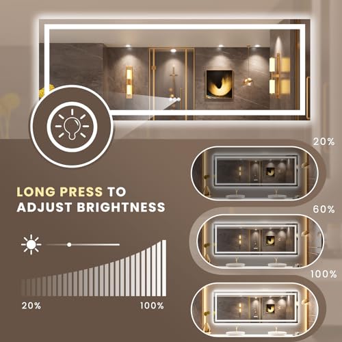 Touch Switch Hi Tech Smart Bathroom Mirror LOAAO led bathroom mirror brings a modern luxury look to your bathroom. 3 light mode options includes cold light white light warm light Very fashionable and unique. Anti-Fog and Memory Functions Fogless mirror with anti fog functions. No worry about wiping down a mirror after shower. A clean and clear mirror for you always. Also memory function helps remembers the last setting that you’ve used. So you don’t need to reset the setting each time you turn on the mirror. Very smart hi tech end.. Brightness Adjustable The LOAAO light up bathroom mirror is dimmable. Long press the touch switch on the lighted mirror to adjust the brightness range from 20% to 100%. Short press to select the light modes you desired.Backlit + Front Lighted Super Bright Double lights source from back and front. The lighted bathroom vanity mirror brings enough light for you to apply makeup and shaving. Easy to i
