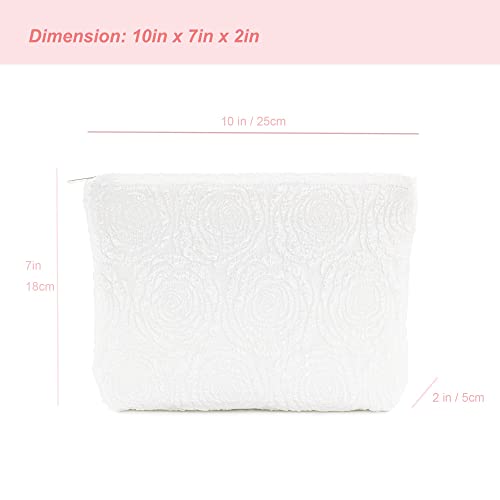 Elegant Design:The unique appearance design makes this handbag fashionable and gorgeouse perfectly shows elegance and beauty.Material: Made of super soft water-repellent fabric with canvas lining easy to clean.It will not lose color after the wash.The smooth zipper with a shiny metal pull keep your items secure and organized inside.Multi-Purpose:Use this sturdy pouch to easily pack and carry makeup jewelry beauty items brushes pencils small electronic accessories toiletries essential oils medcine tools or other travel essentials.This cosmetic pouch is the perfect balance between funchtion and style.Large Capacity:Large enough to fit all of your makeup yet small enough to take it on-the-go.Dimensions(Overall):10inchesX7inches.Great for Travel:Organization has never been easier use this portable makeup bag for toiletries or small knick-knacks while traveling and they can also be easily stored in any purse backpack tote bag or suitcase.