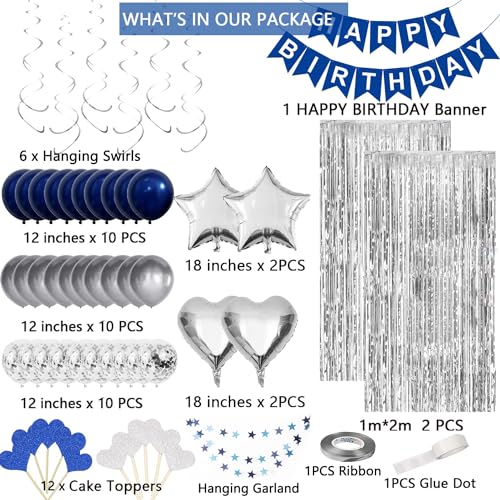 Blue Birthday Party Decorations Happy Birthday Banner Silver Fringe Curtain Heart Star Foil Confetti Balloons Hanging Swirls for Men Women Boys Girls Birthday Party