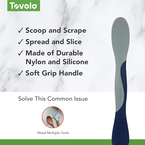 Measuring 11\" in overall length this Tovolo Scoop and Spread tool is a catch-all tool that fits right into any kitchen utensil set or aesthetic. Flexible silicone makes one end great for scraping food processors or mixing bowls and scooping finished product into containers. Nylon design on the other end makes it easy to spread jellies jams butter and cheeses while the oversized handle in the center is sure to keep your hand clean while you meal prep and cook. Coming in a Deep Indigo tone it's neutral aesthetic allows it to blend seamlessly with any color scheme. Made from BPA-free plastic and silicone this set of tools is dishwasher safe making for easy cleanup!