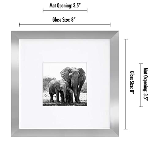 Specifications & Details: This Americanflat 8x8 Picture Frame in Silver measures 8x8 inches and is designed to display photos in both horizontal and vertical formats. The frame is made from composite wood (MDF) and features shatter-resistant glass for added safety. The included white beveled mat allows for 4x4 photo display, while the frame can also hold 8x8 photos without a mat. The hanging hardware and easel stand provide flexibility in display options, making it easy to showcase your favorite photos on a wall or tabletop.