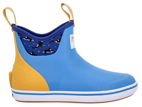 The Salmon Sisters Ankle Deck Boot collection by XTRATUF is crafted for the outdoors. Designed by Alaskans the Salmon Sisters features fun prints and colors. This women's pull-on boot in light blue shares the slip-resisting Chevron outsole and XPRESSCOOL liner found on the XTRATUF Legacy boot collection. Reaching 6 inches in height this plain toe outdoor deck boot with a mermaid print on side gore is constructed with hand-layered rubber which is not classified as a commercial grade rubber but is waterproof and delivers on slip-on-and-go styling. The XTRATUF ankle deck boot is a comfortable option to wear on the boat or out and about. Pick up your pair today.