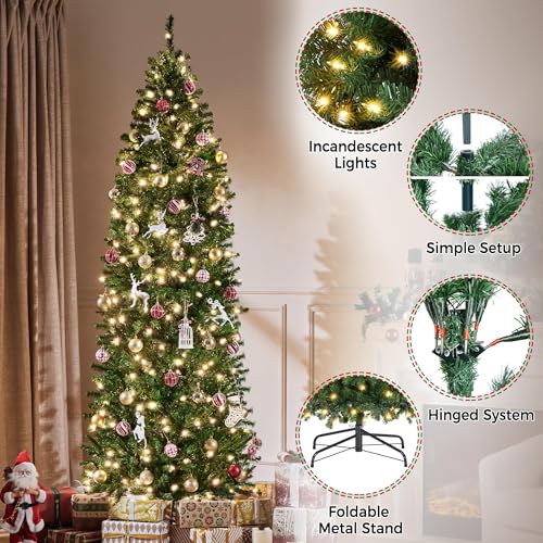 SHareconn 6ft Prelit Snow Flocked Artificial Hinged Slim Pencil Christmas Tree with Remote Controlled Multi-Color RGB Lights Full Branch Tips Good Choice Decoration for Xmas Holiday 6FT Flocked Green