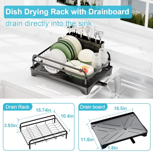 TOOLF Extendable Dish Rack Dual Part Dish Drainers with Non-Scratch and Movable Cutlery Drainer and Drainage Spout Adjustable Dish Drying Rack for Kitchen 1 Piece Black