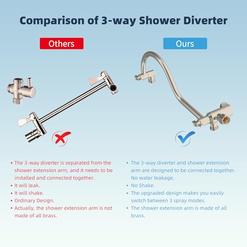 The height and angle adjustable curved-shaped design enhances the bearing capacity allowing the all-metal shower head to be raised to achieve a vertical water flow. In comparison to a regular shower arm extender the Hibbent 12-inch shower arm extension can adjust the shower head to a higher or lower position while keeping it horizontal. This rainfall shower head combo is extremely easy to install without the need for tools or professional plumbers. The 3-way diverter can be used with a single shower head or rainfall shower head or with two showers simultaneously.