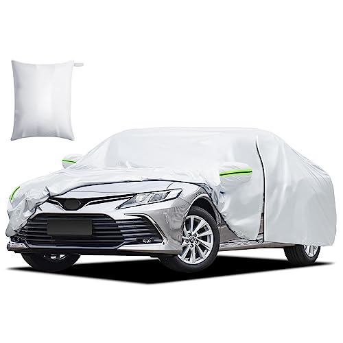 【Premium Material】GUNHYI full exterior cover is suitable for use in all seasons. 1- Made of high-quality material vinyl better waterproof more wear-resistant and tear-resistant. 2- It has good sunproof and anti-ultraviolet effect the vehicle can keep cool in hot weather. 3- The inner lining is upgraded soft cotton that would protect vehicle paint better. 【All Weather Protection】GUNHYI heavy duty car cover suitable for indoor and outdoor use can effectively protect your vehicle from sun uv-rays dust snow fallen leaves industrial pollution bird droppings pollen animals acid rain and extreme weather. 【Unique Design】1- Breathable vents effectively prevent moisture accumulation and keep dry. 2- Thickened material Mirror pockets Three windproof straps at front middle and rear which can prevent the car cover from being blown away in strong winds. 3- Driver door zipper design for easy access. 4- Comes with a microfiber towel that you can use to clean your car because if t