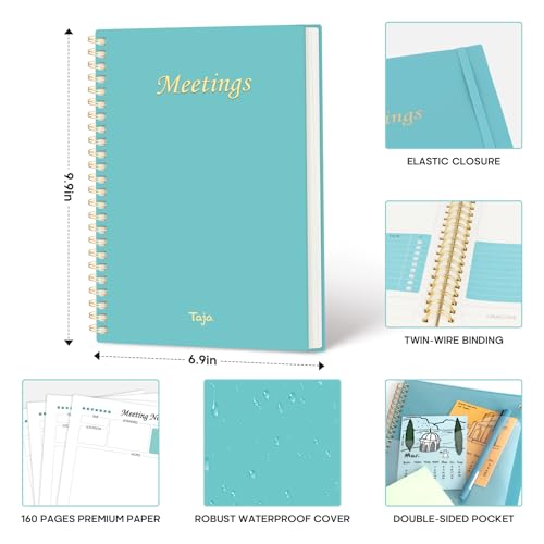 Meeting Notebook with Action Items: 1.MEETING PLANNING: Date Location Title & Attendees 2.NOTES AREA 3.MEETING AGENDA: Discussion Items & Meeting Duration 4.ACTION ITEMS: Action Steps Person Due Date & Check Box 5.NEXT MEETING: Date Time & Location 6.INDEX PAGE: Date Title Page Number which will help create more effective meetings and good results. Premium Quality Notebook for Work: Golden spiral binding is sturdy and flexible with easy-to-turn pages. Hot-stamped cover is water-resistant and not easy to bend. Elastic closure band and back pocket keep the project planner organized and not flimsy at all. Round corner design prevents paper from curling. Perfectly hold up well to frequent transfers in and out of backpacks briefcases and cars. Fight Ink-bleeding & Great Size: The high-end 100gsm paper could prevent ink bleeding through or feathering handle double-sided writing and most daily use pens pretty well. Mark and identify the important sections with the included 5 Packs