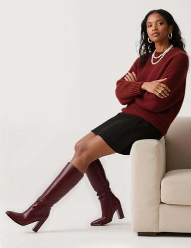 Easyfox Burgundy Knee High Boots Women Pointed Toe Chunky He...