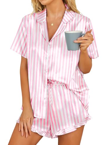 HOTOUCH Womens Silk Satin Set Two-Piece Button Down Short Sl...